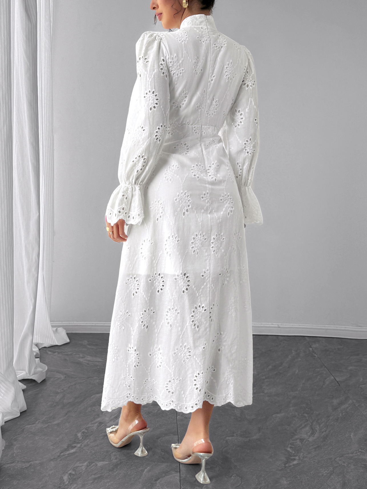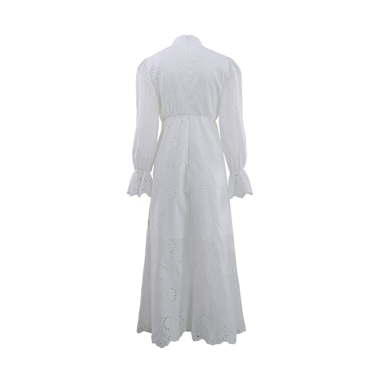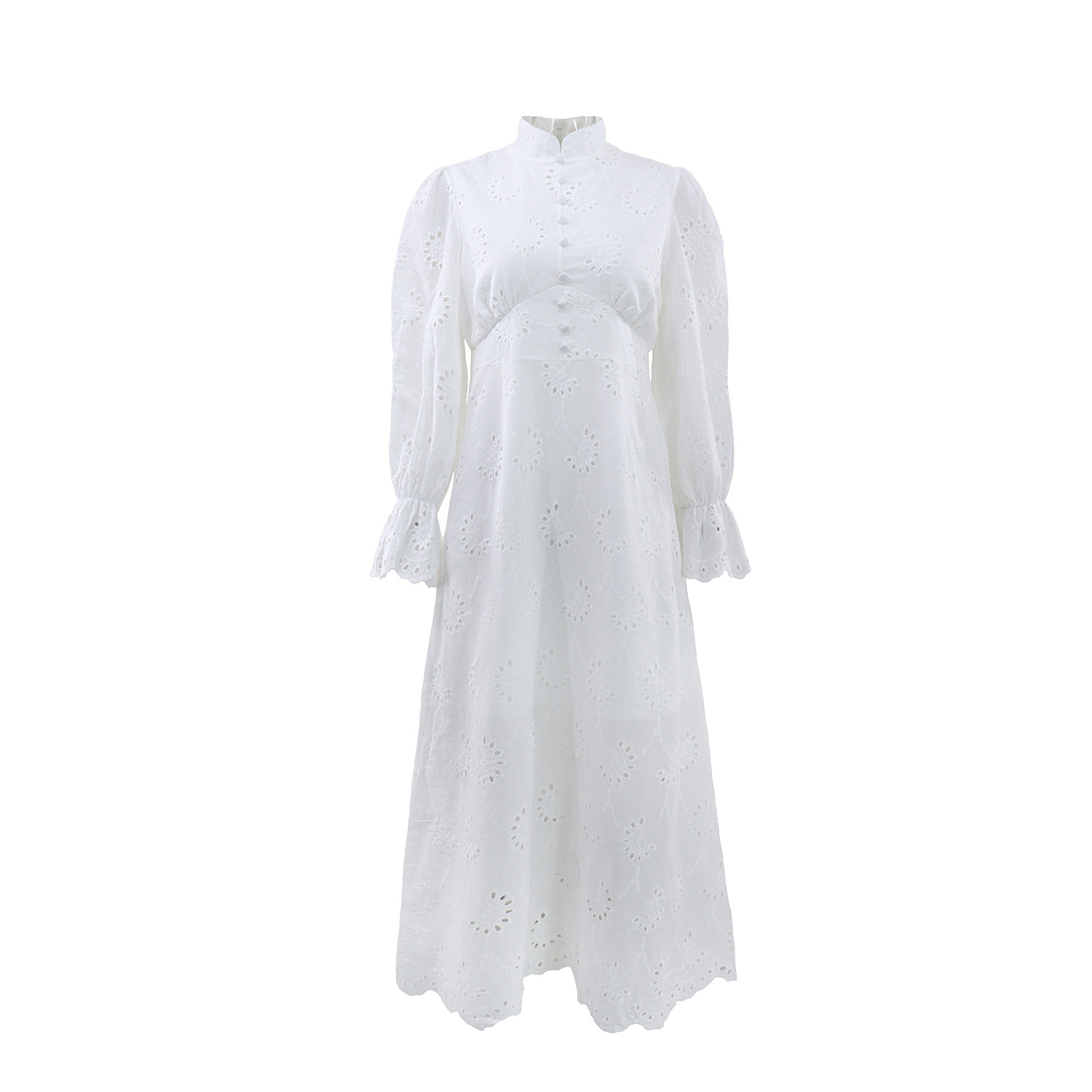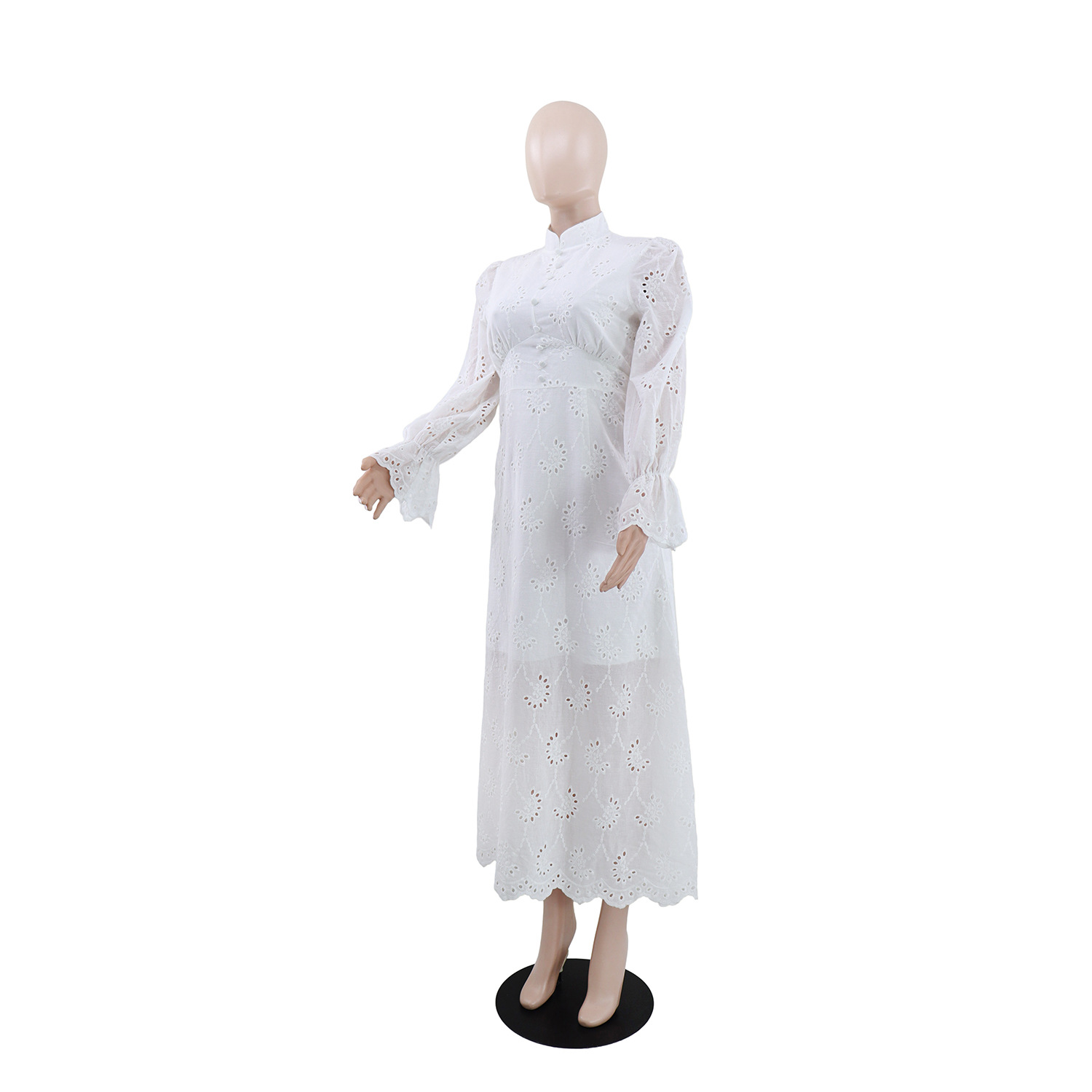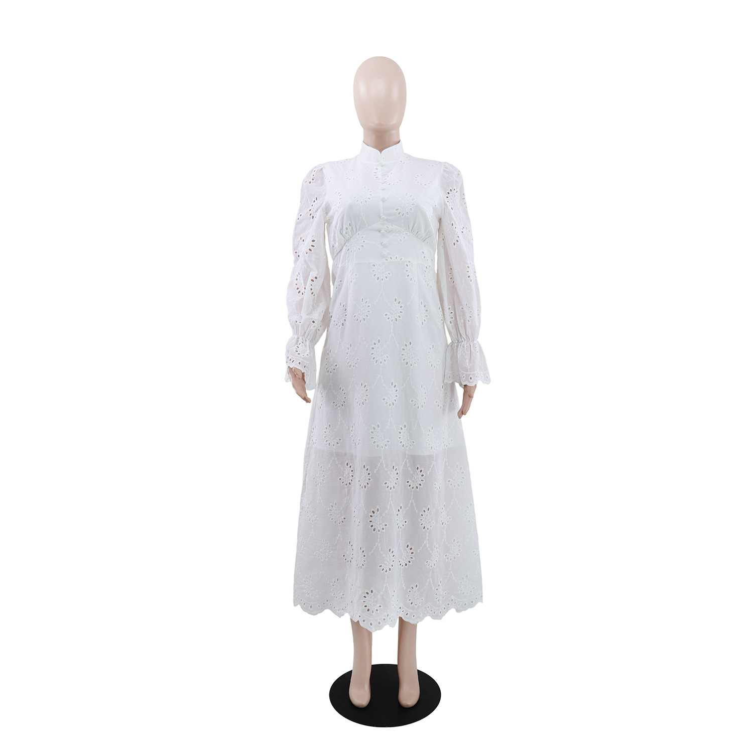 Elegant Vacation Long-Sleeve Hollow-Out Waist-Cinching Button Dress